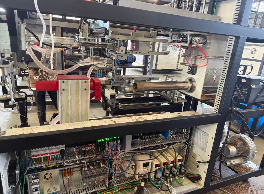定量裝填是機器的核心功能。圖片中部的橫向圓柱形部件就是裝填機構。其內部有一個螺旋輸送器(絞龍),通過變頻器(YD280T4-11G/15PB)對電機的精確控制,螺旋輸送器旋轉,將物料從料倉底部推送至出料口,通過控制螺旋輸送器的旋轉圈數或時間,可以精確控制每袋的裝填量,確保每袋重量一致。